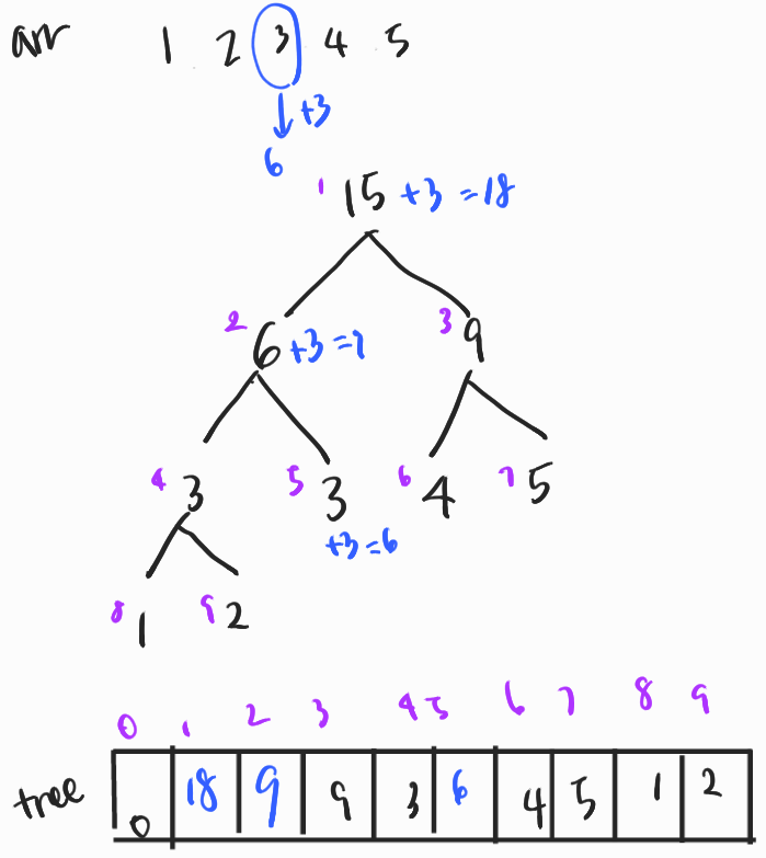 첫째 줄에 수의 개수 N(1 ≤ N ≤ 1,000,000)과 M(1 ≤ M ≤ 10,000), K(1 ≤ K ≤ 10,000) 가 주어진다. M은 수의 변경이 일어나는 횟수이고, K는 구간의 합을 구하는 횟수이다. 그리고 둘째 줄부터 N+1번째 줄