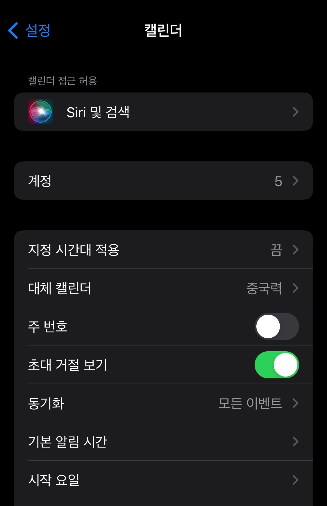 에서 생일, 이벤트, 하루 종일 이벤트의 알림시간을 설정하면 된다