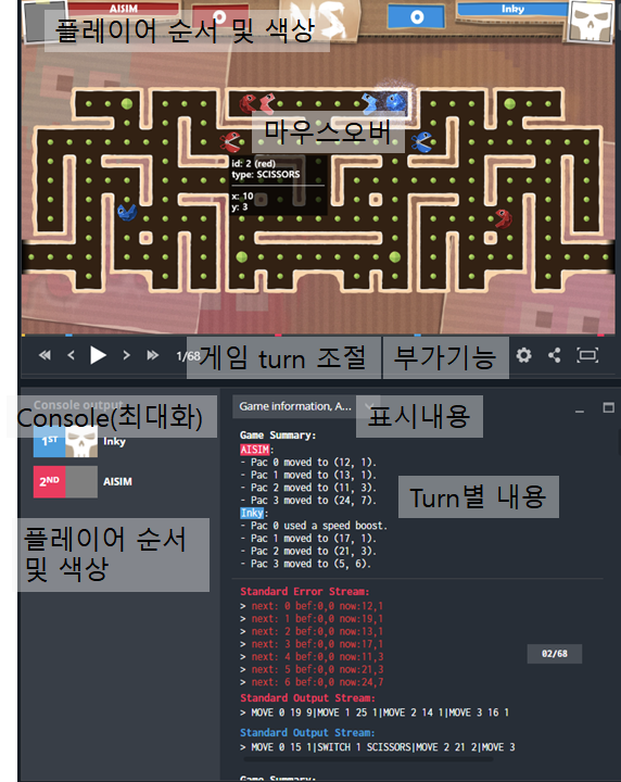- 플레이어 순서 및 색상: 표시된 플레이어 색상이 화면의 캐릭터, Console의 메세지 내용에 반영